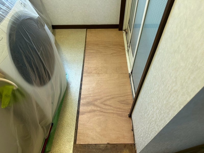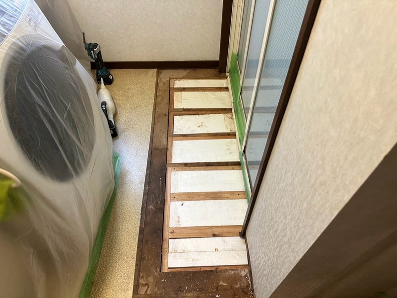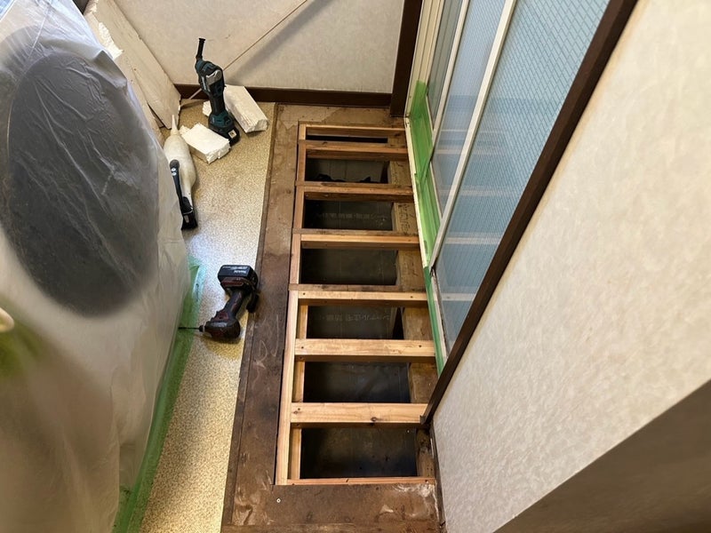 浴室の前の床が腐って穴が開いてました。