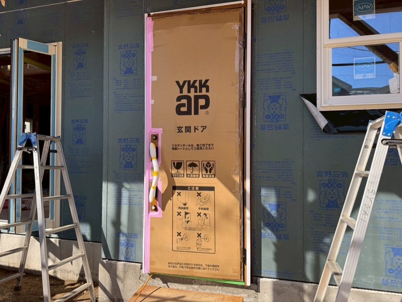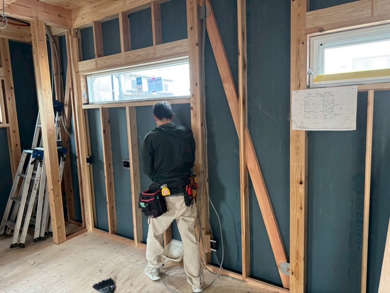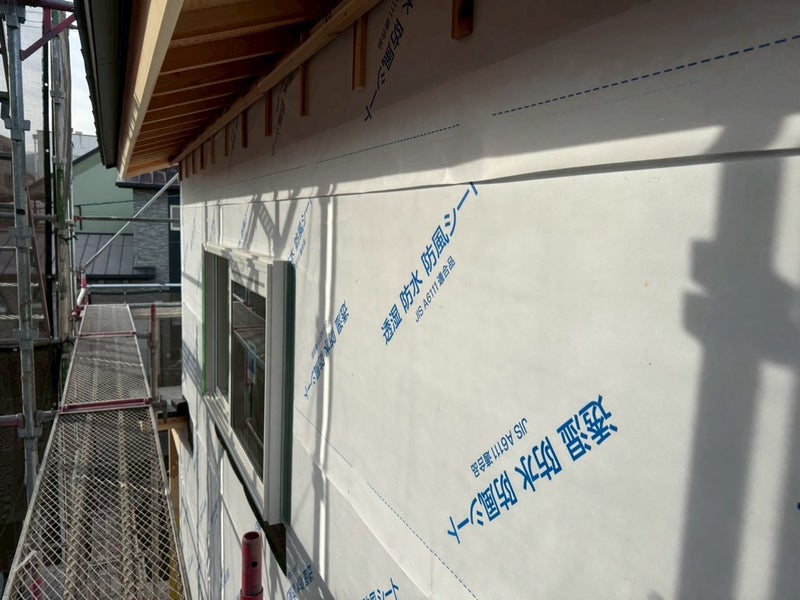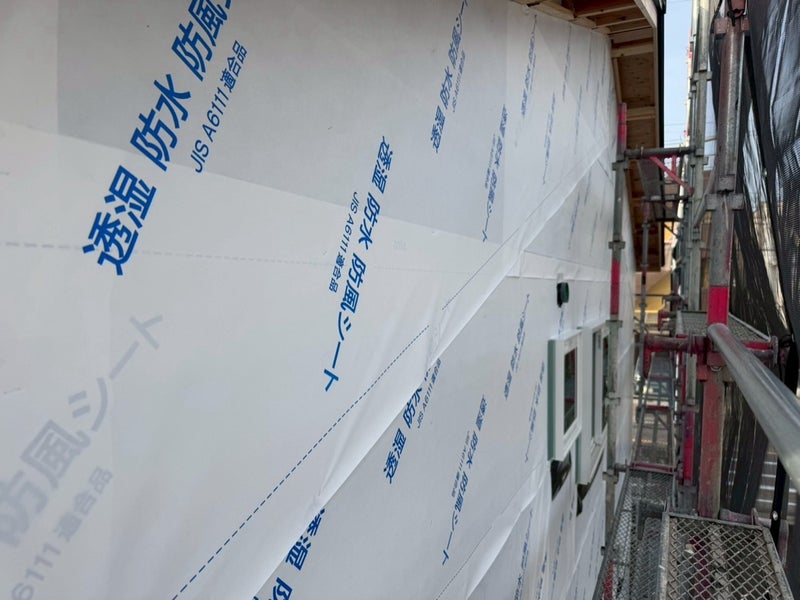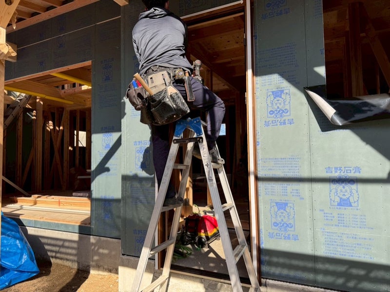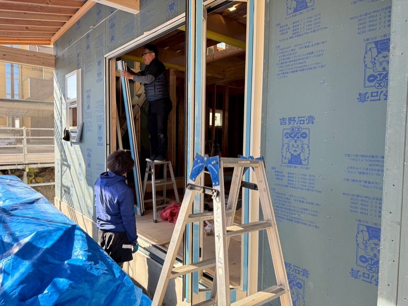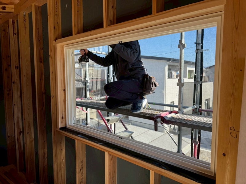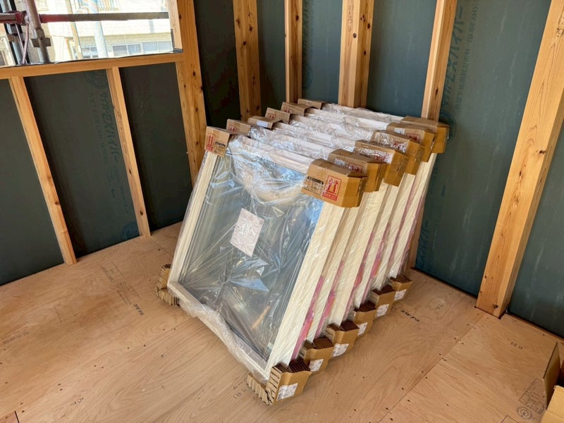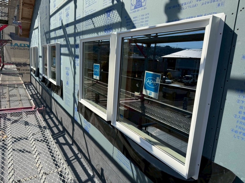 サッシを入れて透湿防水シート貼りました。