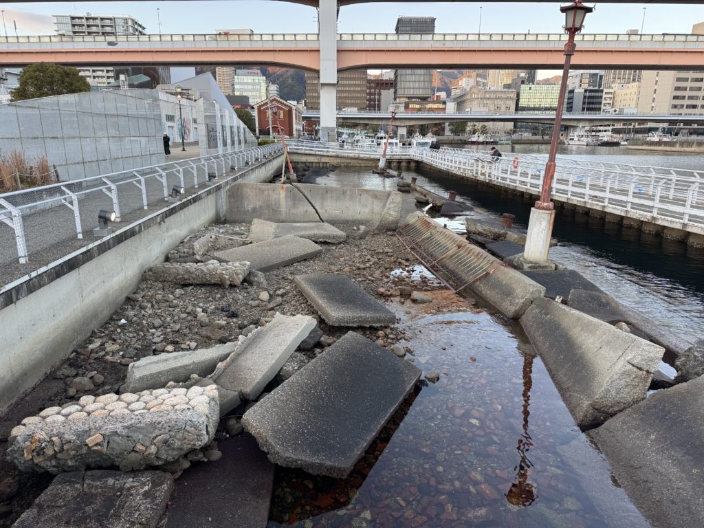 1995年の阪神・淡路大震災で被災・崩壊震災の記憶を伝えるため、崩れた護岸の一部や係留柱などが残されているのですが、想像以上に生々しい光景が残っていました。